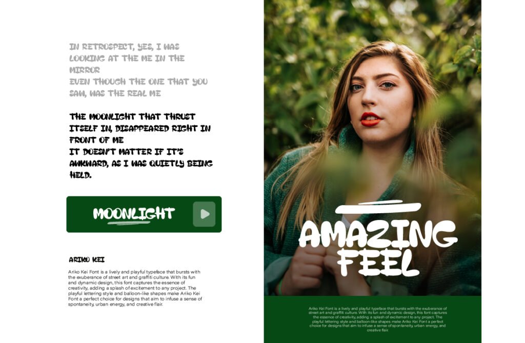 Despite its decorative nature, the font maintains excellent readability at larger sizes, making it ideal for use in posters, logos, banners, and promotional graphics. Available in multiple versions—including outlined, shadowed, and textured—Ariko Kei allows for creative layering and customization to enhance its expressive appeal. Ariko Kei works exceptionally well in environments that emphasize fun, childhood, and creativity. It pairs beautifully with neon gradients, illustrated backgrounds, and pastel color schemes, reinforcing a sense of innocence and visual storytelling. Whether used in apparel branding, event promotions, or digital illustrations, this font enhances the emotional tone and visual impact of any project.