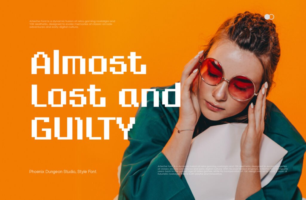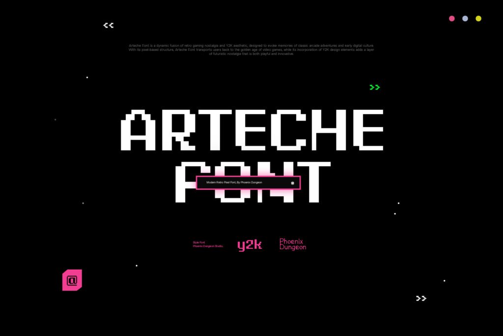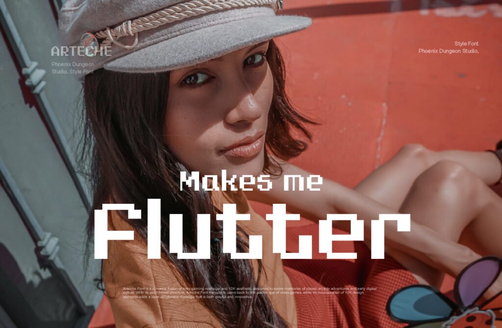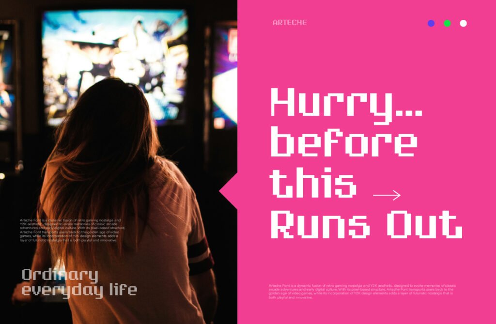 Despite its digital roots, Arteche is highly adaptable to both print and screen-based formats, making it ideal for use in posters, logos, banners, and UI/UX elements where a vintage-modern contrast is desired. Available in multiple versions—including outlined, shadowed, and neon-lit—Arteche allows for creative layering and customization to enhance its nostalgic appeal. Arteche works exceptionally well in environments that emphasize digital revivalism, underground culture, or playful design. It pairs beautifully with glitch effects, chrome gradients, and vaporwave-inspired visuals, reinforcing a sense of Gen Z nostalgia and visual storytelling. Whether used in indie game titles, tech startup branding, or animated motion graphics, this font enhances the emotional tone and visual impact of any project.