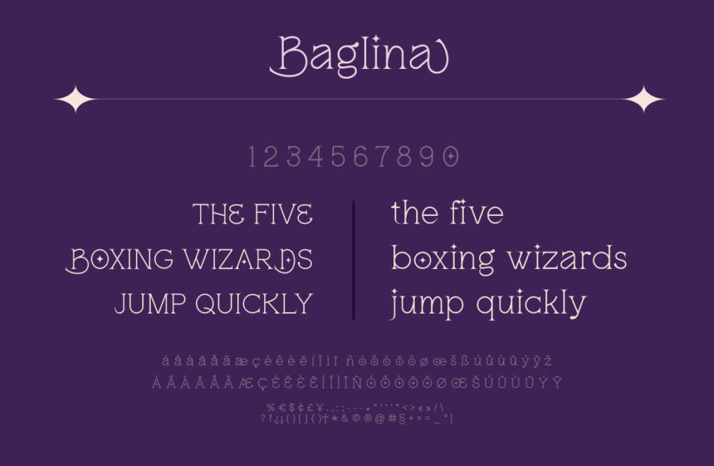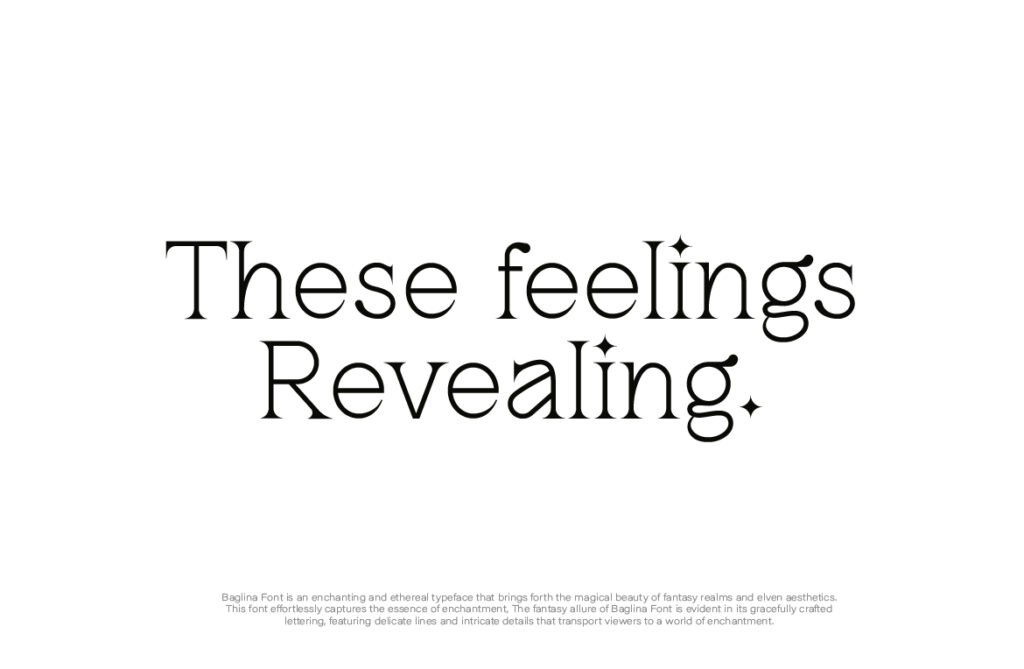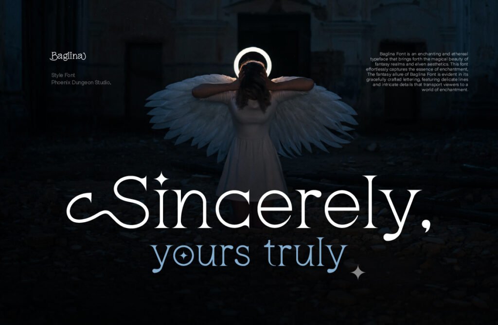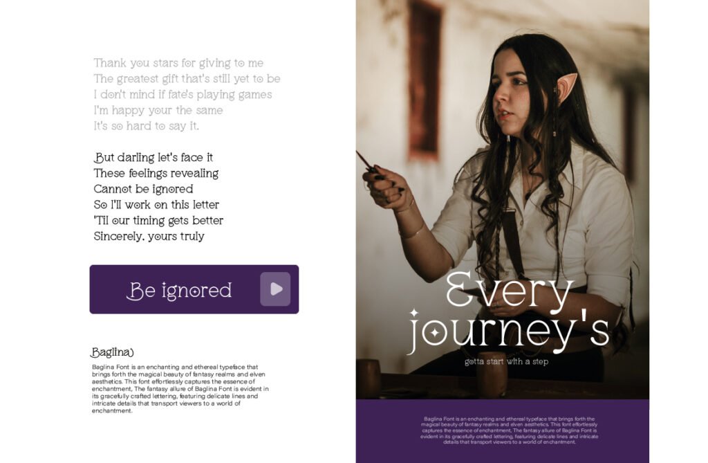 The font includes a wide array of ligatures, alternate characters, and decorative glyphs, allowing for creative customization that enhances its magical appeal. It performs exceptionally well in both print and digital formats, especially at medium to large sizes, making it perfect for titles, captions, and quote-based designs. Baglina works particularly well in branding for children’s products, fantasy-themed merchandise, and animated media. It pairs beautifully with pastel color palettes, hand-drawn illustrations, and glitter effects, reinforcing a dreamy and ethereal aesthetic. The font also supports multilingual characters and OpenType features such as stylistic alternates and contextual swashes, ensuring professional-grade flexibility across design platforms.