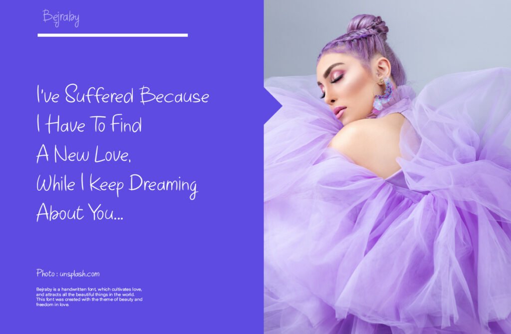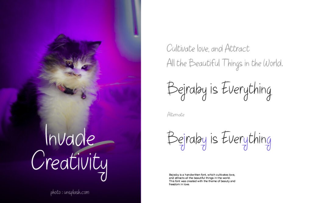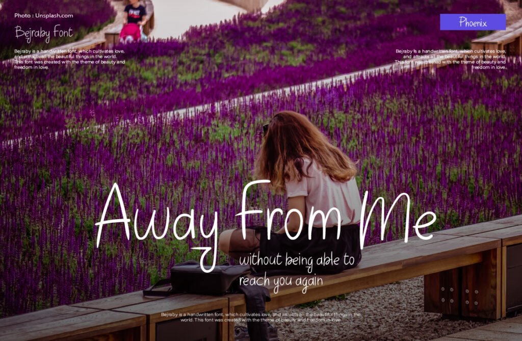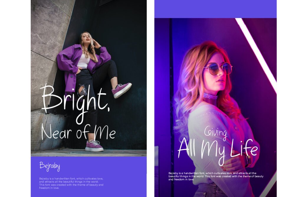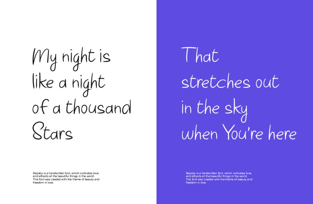 It’s especially powerful in minimalist layouts where space and typography share equal weight. In wedding invitations, perfume labels, or emotionally driven social content, Bejraby adds just enough texture to feel human without overwhelming the design. Its delicate rhythm evokes vulnerability and openness. It speaks directly to the heart without needing to raise its voice. It thrives in the in-between spaces—moments of silence, softness, and reflection. If your visual tone is gentle, personal, and romantic, Bejraby adds that final handwritten touch that makes every message feel like a note meant only for the reader.
