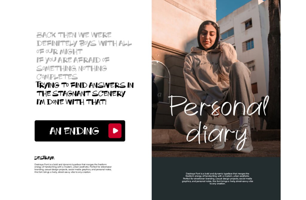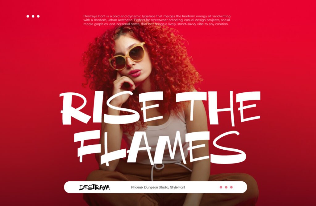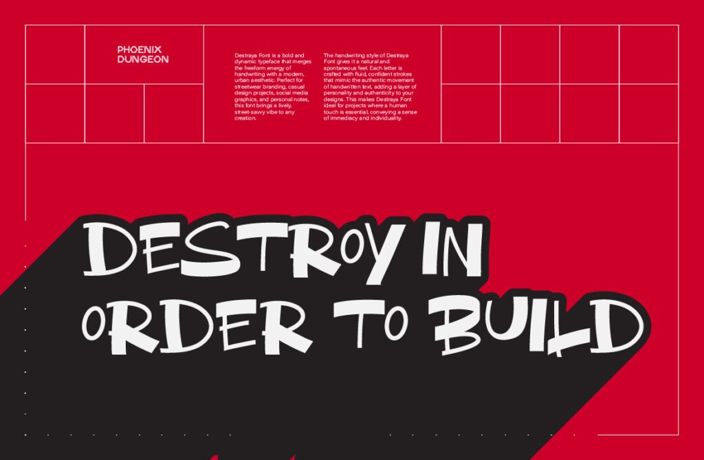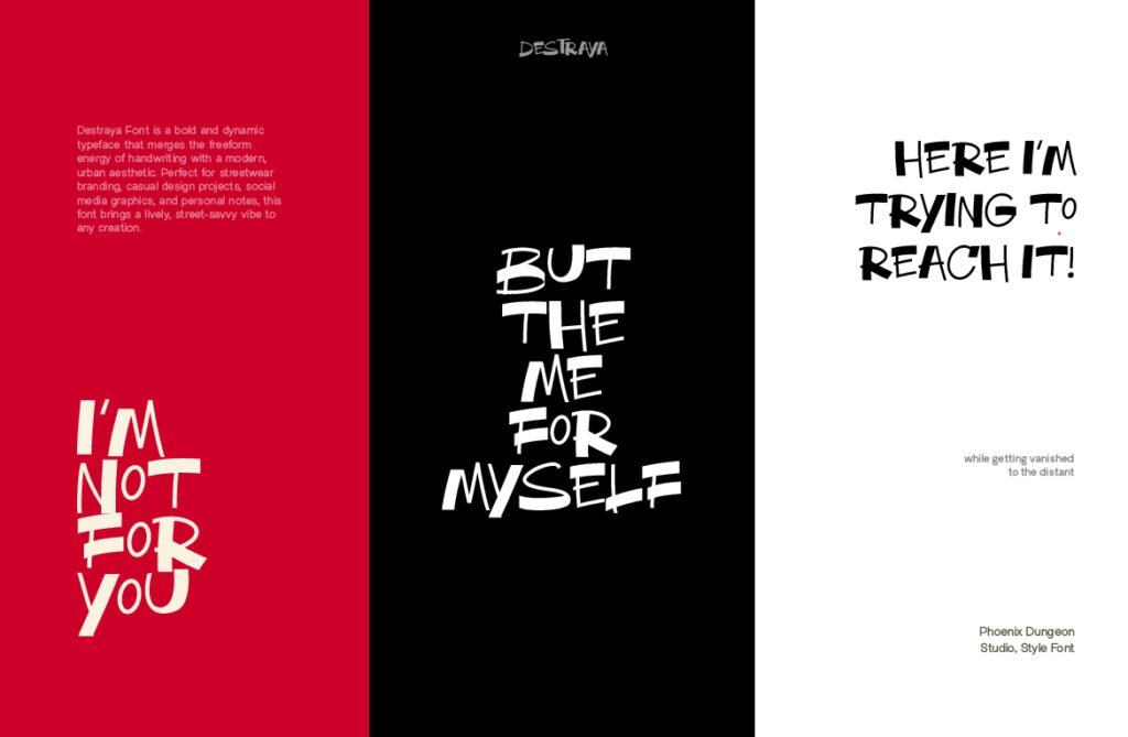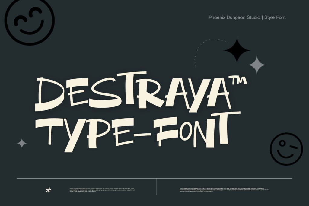 Destraya – Brush street style display urban is a bold and expressive typeface that captures the raw energy of graffiti, street art, and urban culture. With its textured brushstrokes, uneven baselines, and high-contrast detailing, Destraya brings a sense of authenticity, rebellion, and movement to any design project. Whether used in branding for streetwear, music visuals, or animated content, this font adds a layer of urban authenticity and visual flair that enhances the overall emotional tone. Each letter in Destraya mimics the dynamic strokes of real graffiti markers and spray paint, giving it a tactile and powerful presence that feels both spontaneous and intentional.