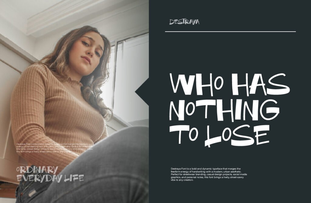 Despite its intense visual style, Destraya maintains clarity and legibility, especially in large-scale applications such as posters, apparel branding, and digital banners. The font supports alternate characters, ligatures, and stylistic swashes, allowing for personalized text composition that enhances its expressive potential. Destraya works exceptionally well in environments that emphasize youth culture, rebellion, and creative expression. It pairs beautifully with chrome effects, neon gradients, and illustrated backgrounds, reinforcing a sense of urban authenticity and visual storytelling. Whether used in logo design, event promotions, or product packaging, Destraya adds a layer of raw energy that enhances the overall design experience.