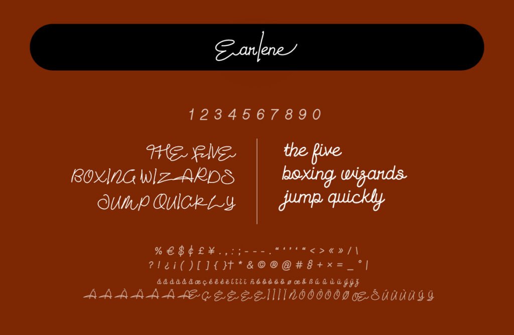 Each letter in Earlene has been carefully crafted to reflect the elegance of hand-drawn script, complete with subtle variations in stroke thickness and graceful ligatures that enhance its organic feel. The font includes a wide range of alternate characters, swashes, and contextual forms, allowing designers to create custom-tailored text that feels unique and authentic. Despite its decorative appearance, Earlene remains highly legible, especially when used in medium to large sizes, making it suitable for both print and digital applications.