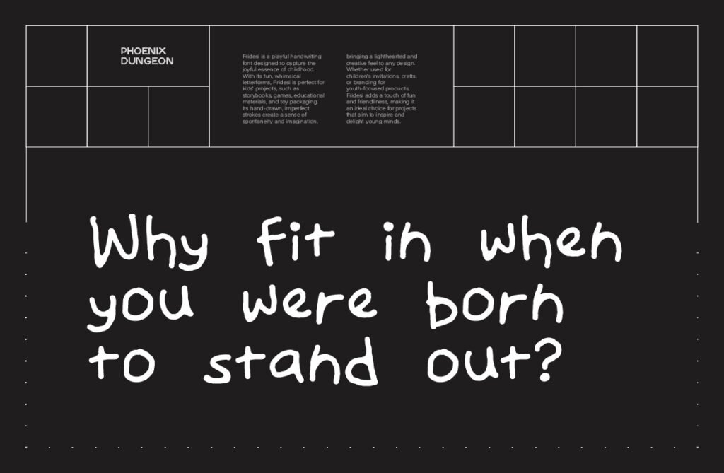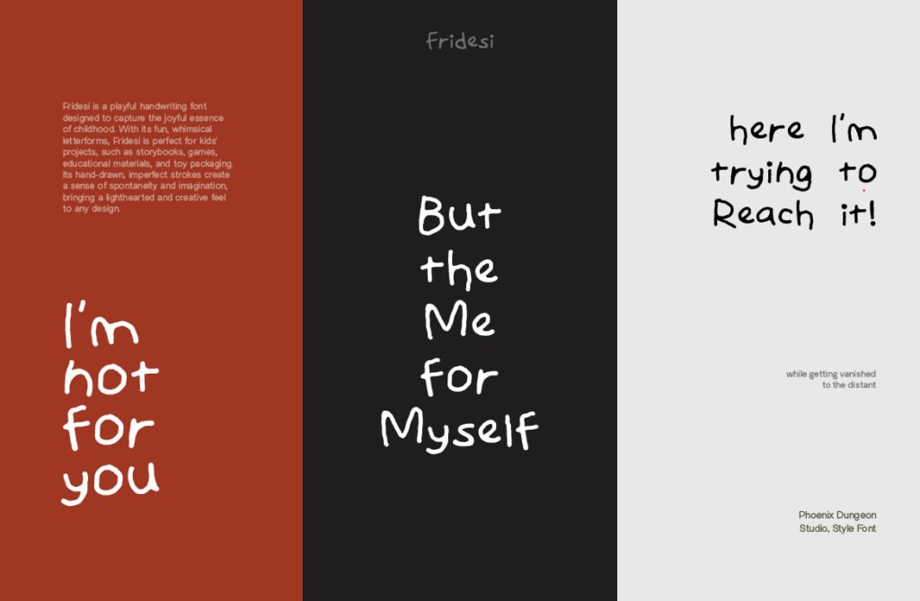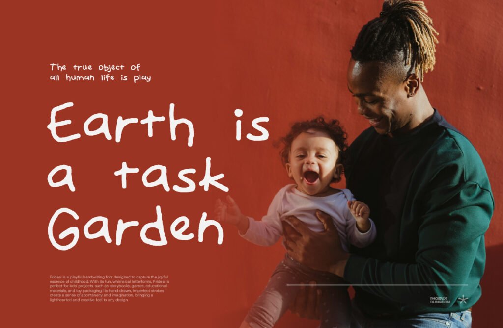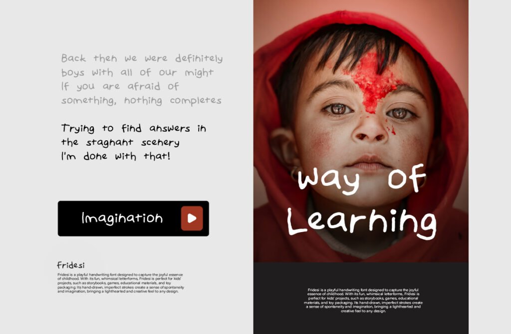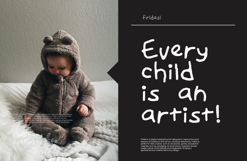 Fridesi – Child handwriting playful display is a charming and expressive typeface that mimics the innocent and spontaneous rhythm of a child’s handwriting. With its bouncy baseline, irregular strokes, and warm character shapes, Fridesi brings a sense of joy, authenticity, and lightheartedness to any design project. Whether used in branding for children’s products, social media content for playful brands, or lifestyle design that wants to communicate warmth and sincerity, this font adds a layer of youthful charm and emotional depth that enhances the overall visual experience. Each letter in Fridesi has been carefully crafted to reflect the natural variation of real children’s handwriting, including ligatures, alternate characters, and swashes that allow for highly customized and dynamic compositions.
