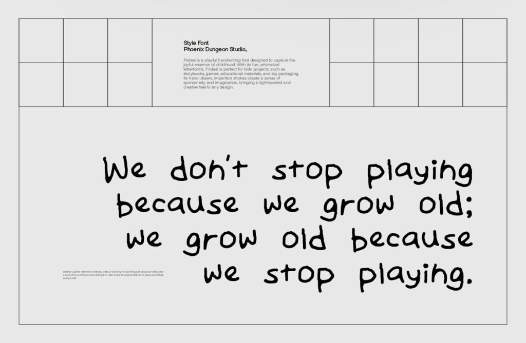 Despite its informal appearance, the font maintains excellent readability at larger sizes, making it ideal for use in posters, packaging, greeting cards, and animated content aimed at younger audiences or playful branding. Fridesi works exceptionally well in environments that emphasize joy, creativity, and innocence. It pairs beautifully with pastel color schemes, hand-drawn illustrations, and soft gradients, reinforcing a sense of warmth and sincerity. Whether used in toy branding, children’s books, or boutique product labels, Fridesi enhances the emotional tone and visual appeal of any design.