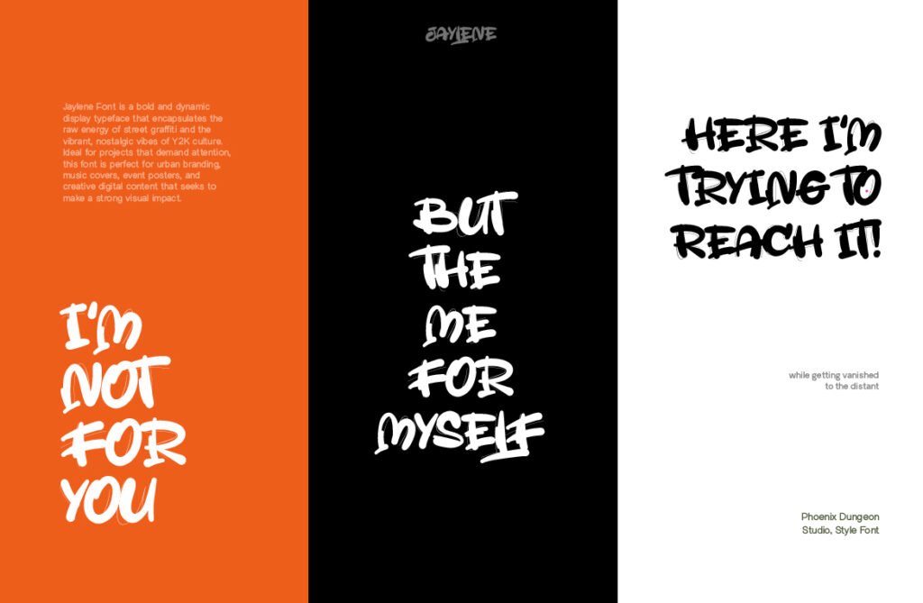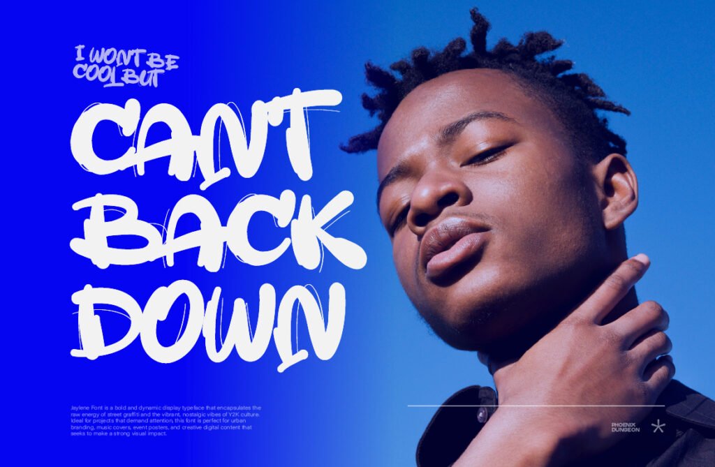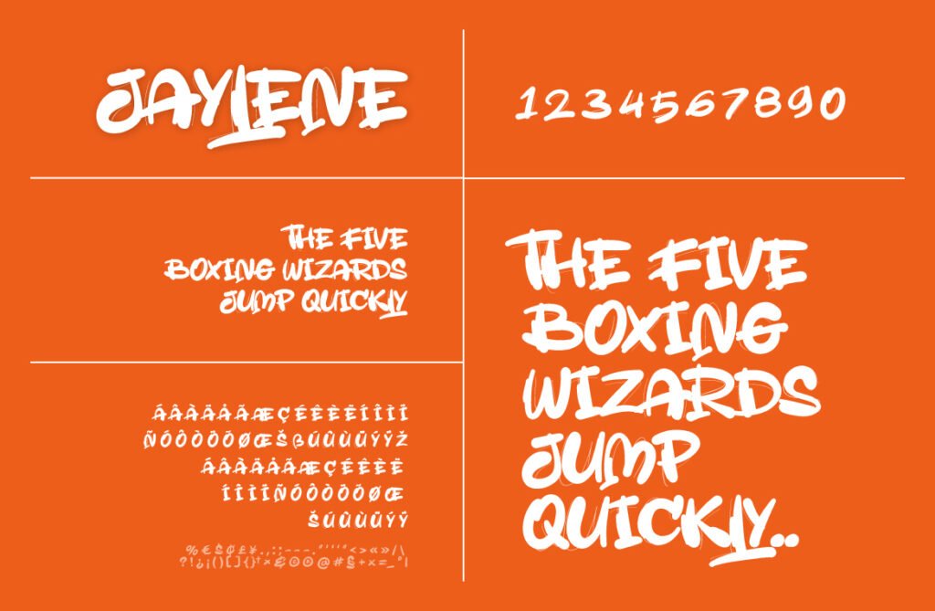 Despite its intense visual style, Jaylene maintains clarity and legibility, especially in large-scale applications such as posters, apparel branding, and digital banners. The font supports alternate characters, ligatures, and stylistic swashes, allowing for personalized text composition that enhances its expressive potential. Jaylene works exceptionally well in environments that emphasize youth culture, rebellion, and creative expression. It pairs beautifully with chrome effects, neon gradients, and illustrated backgrounds, reinforcing a sense of urban authenticity and visual storytelling. Whether used in logo design, event promotions, or product packaging, Jaylene adds a layer of raw energy that enhances the overall design experience.