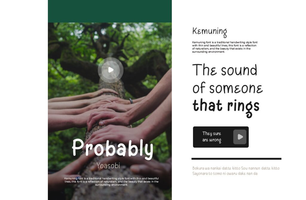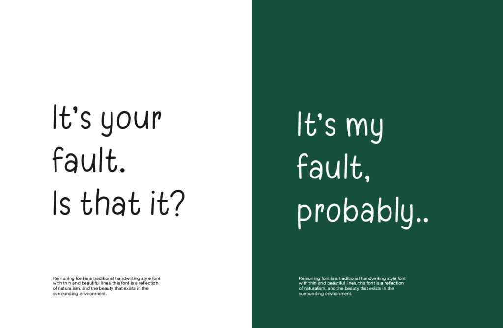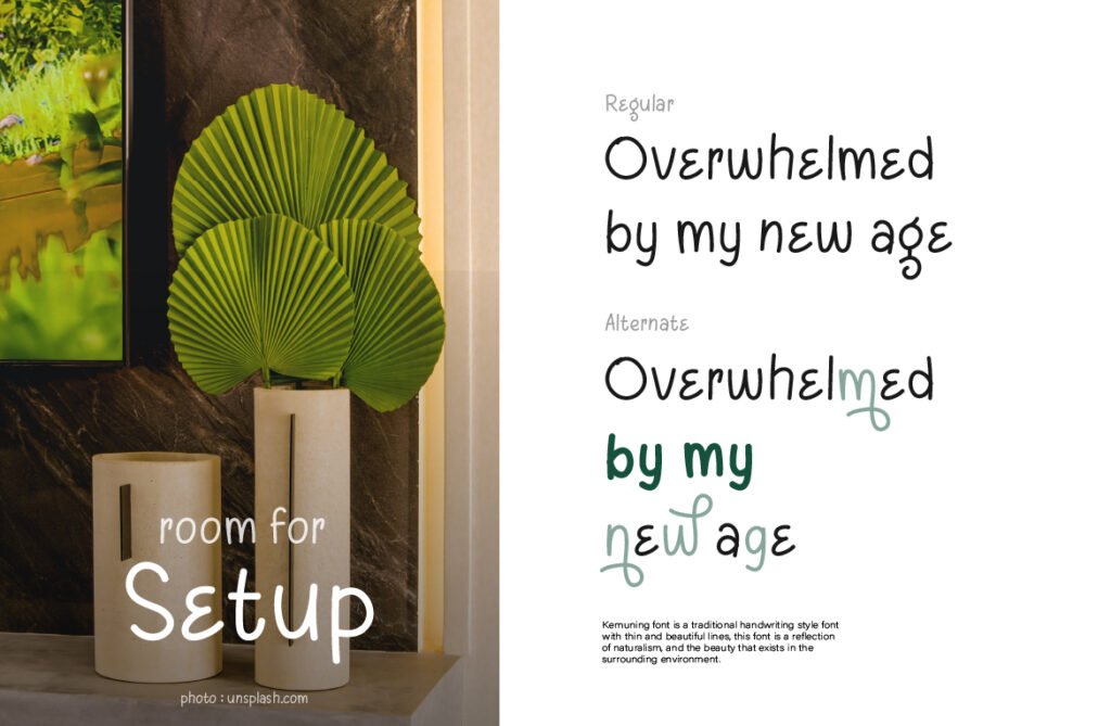 Kemuning’s personality makes it perfect for poetry books, self-care brands, calming editorial layouts, and emotionally charged design projects. It feels handwritten, but its subtle geometry gives it a visual polish that works well in professional compositions. The letters carry a sense of rhythm and breathing room—there’s a therapeutic quality in how the glyphs flow from one to another. It’s great for wellness branding, lifestyle bloggers, or minimalist product labels looking for a softer edge.