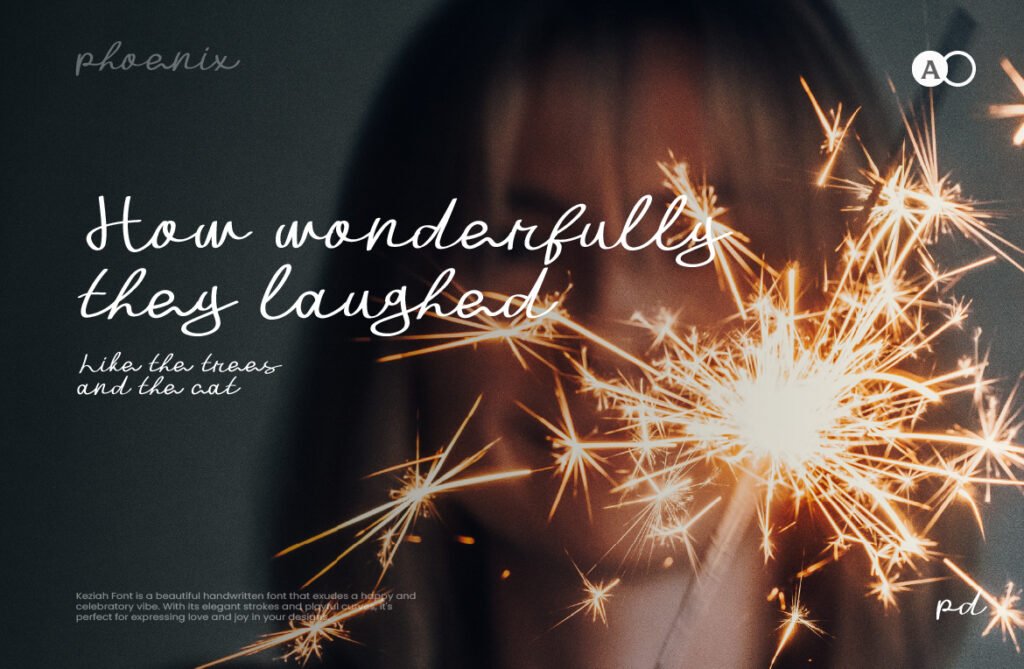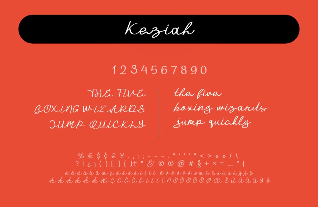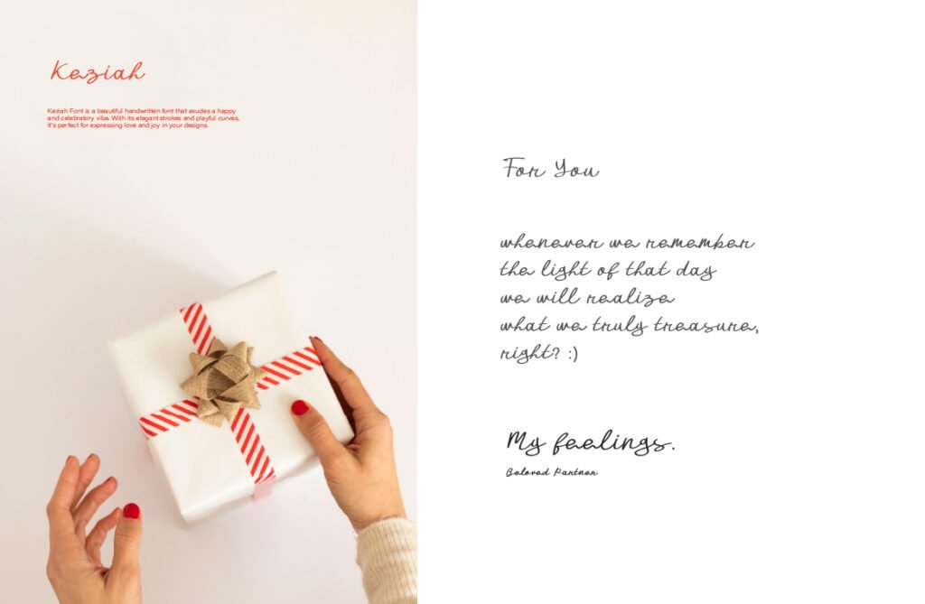 Keziah is perfect for use in wedding invitations, love letters, greeting cards, social media quotes, and branding materials for boutique shops, florists, or lifestyle brands that want to evoke a sense of closeness and affection. The font’s delicate balance between legibility and decorative style ensures that it remains readable while still maintaining its artistic charm. It includes a variety of ligatures, alternate characters, and swashes that allow designers to customize the text for a more authentic and expressive look.