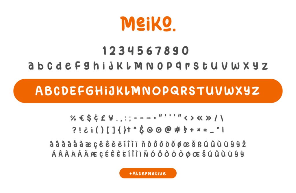 Meiko is cheerful chaos—playful, energetic, and packed with cultural flair. Inspired by Japanese pop aesthetics and bold brush lettering, Meiko blends fun with structure. Each glyph feels spontaneous yet legible, ideal for streetwear, gaming interfaces, or youth-oriented branding.