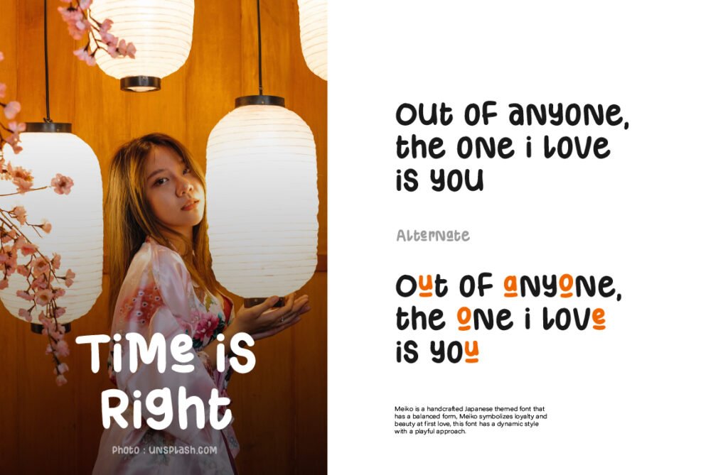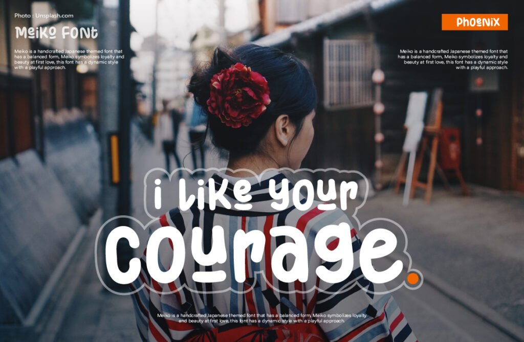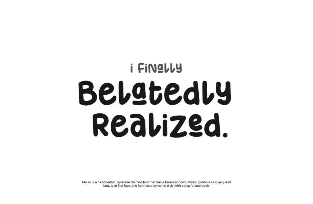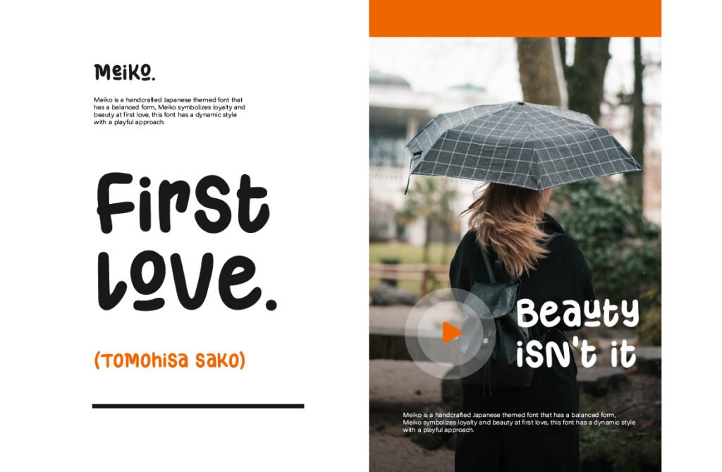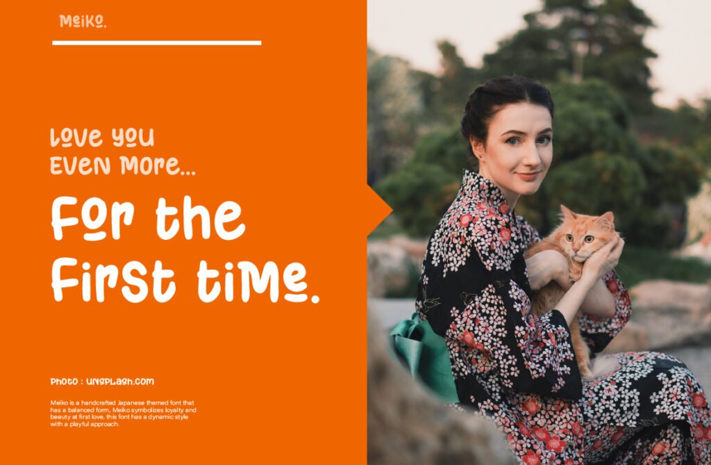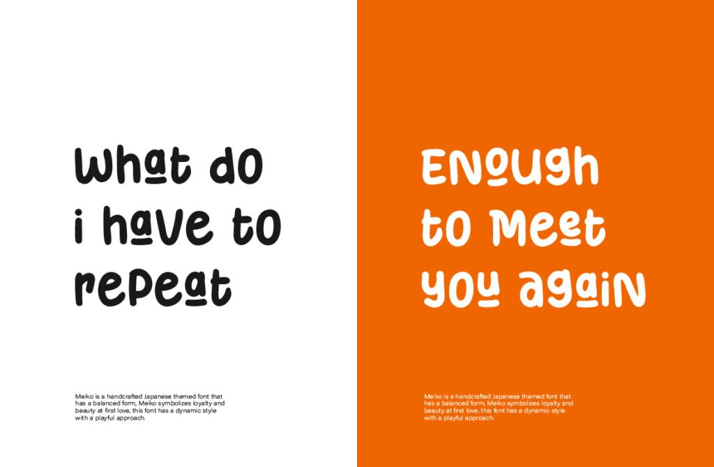 There’s something anime-esque in its rhythm, but also a grounded, typographic balance that makes it usable in real design systems. Meiko’s charm is in its contradictions: it’s both bold and lighthearted, artistic and usable. Use it in headlines where personality matters—whether for food packaging, event posters, or creative tech brands. It doesn’t just communicate—it bounces, waves, and jumps off the page. It’s not just Japanese-inspired. It’s joy, movement, and storytelling—bottled into type.