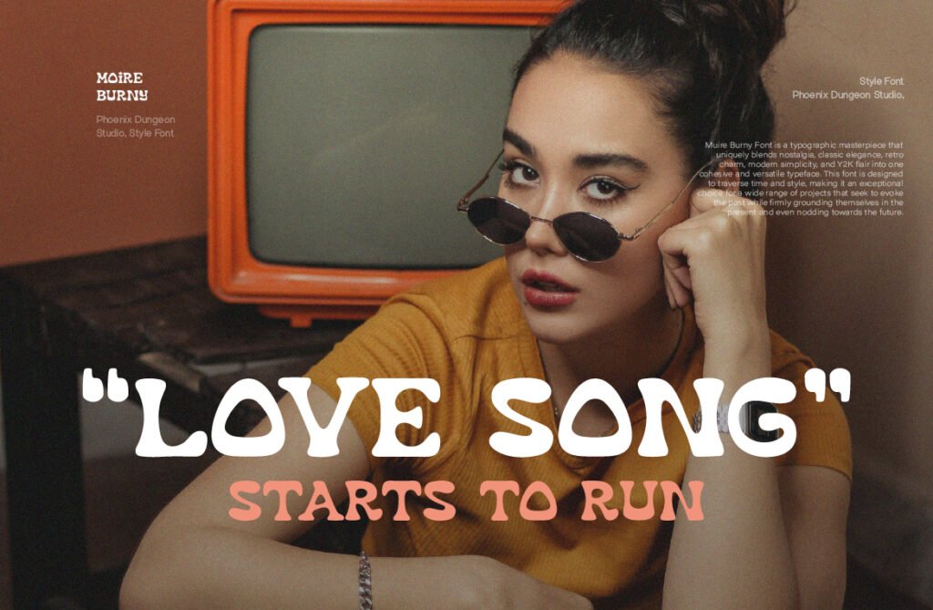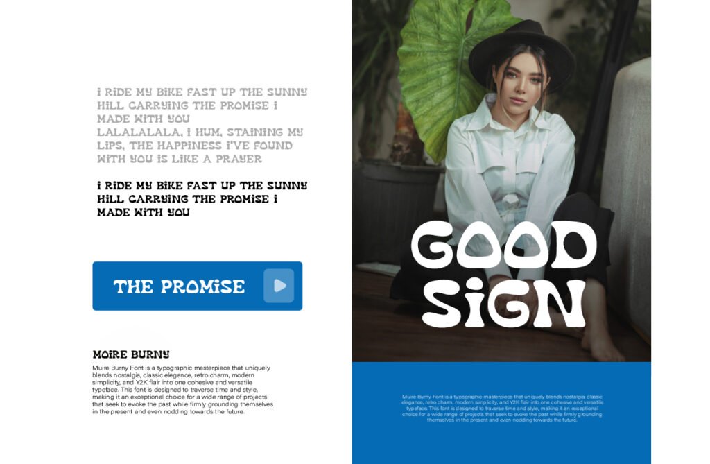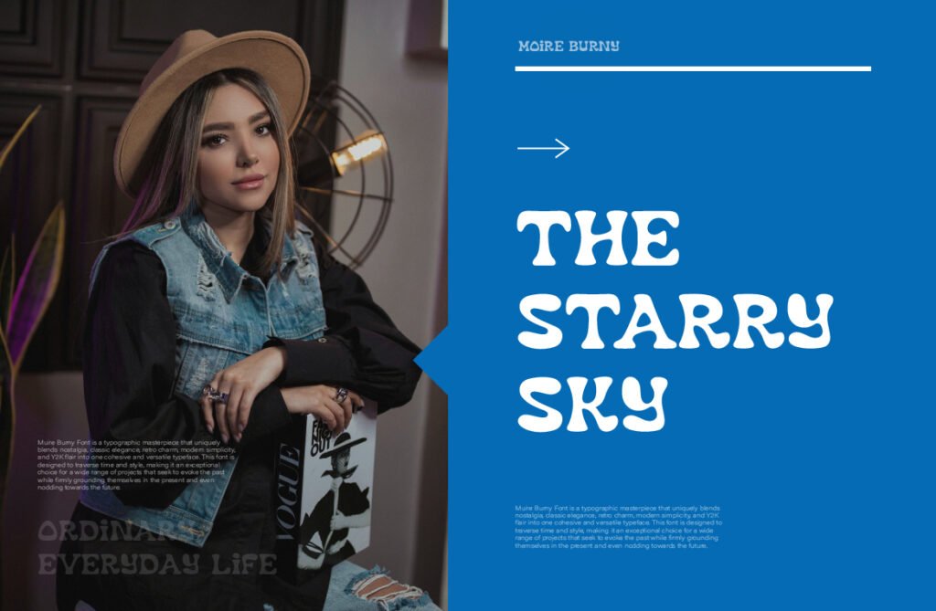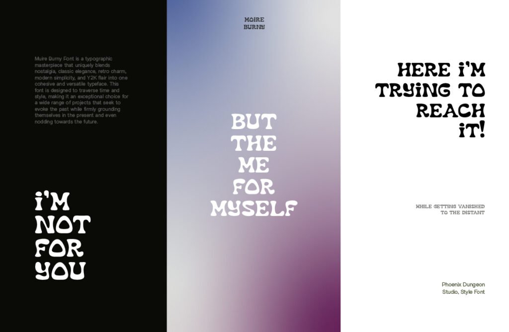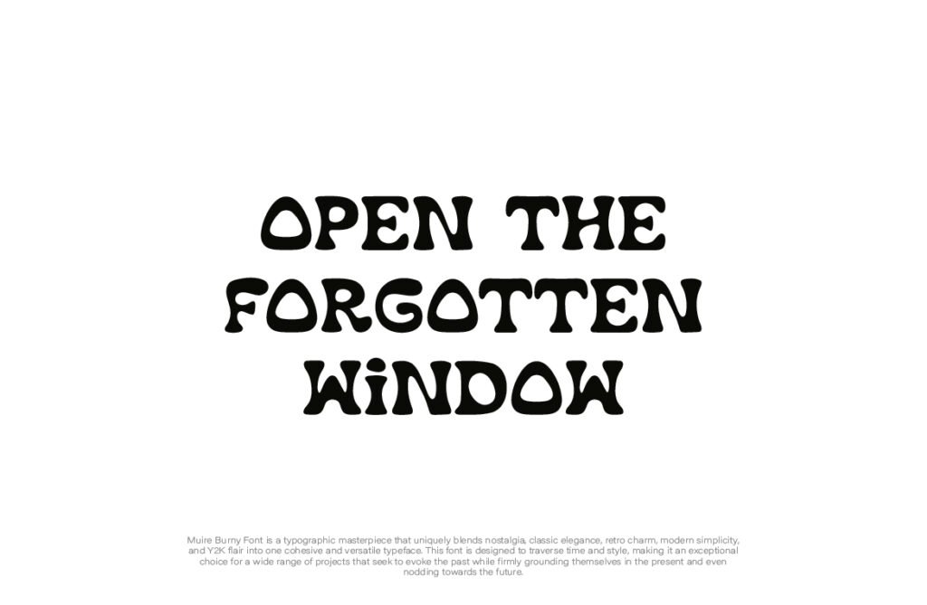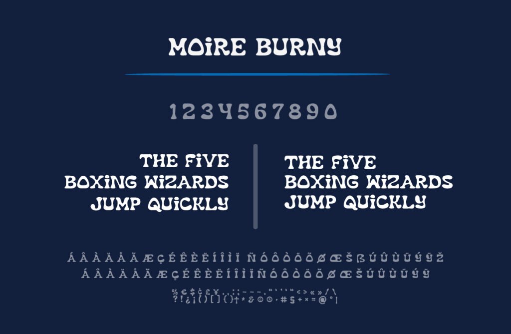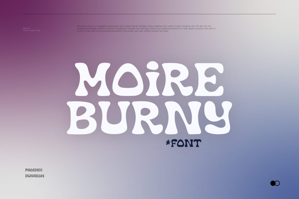 Despite its decorative nature, the font remains highly legible when used at moderate to large sizes, making it ideal for posters, logos, children’s books, and animated content. It supports alternate versions and stylistic sets, allowing designers to customize the look based on theme and context—from bubbly and cute to edgy and futuristic. Moire Burny works exceptionally well in designs targeting younger audiences, retro-themed brands, or lifestyle products that want to inject nostalgia and playfulness into their work. It pairs beautifully with neon gradients, chrome effects, and pixel-inspired textures, aligning perfectly with current trends in Gen Z aesthetics and digital revivalism. Whether used in apparel branding, event promotions, or digital illustrations, Moire Burny adds a layer of fun and personality that enhances the overall design experience.