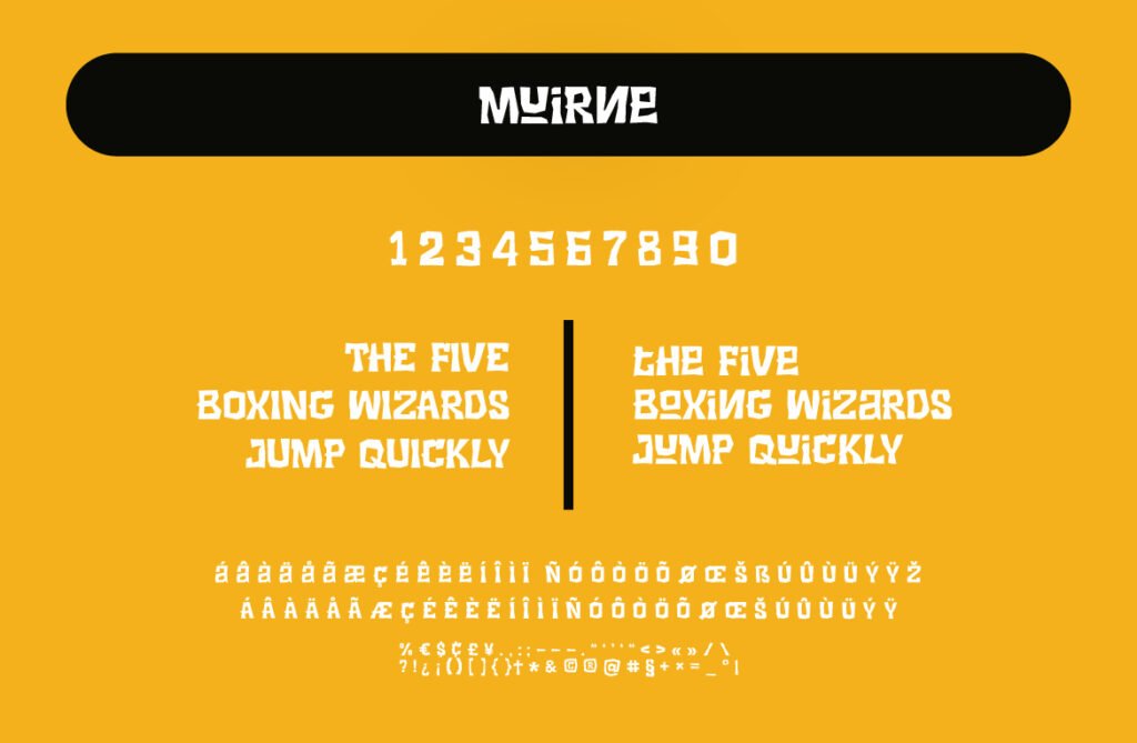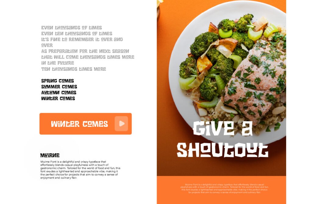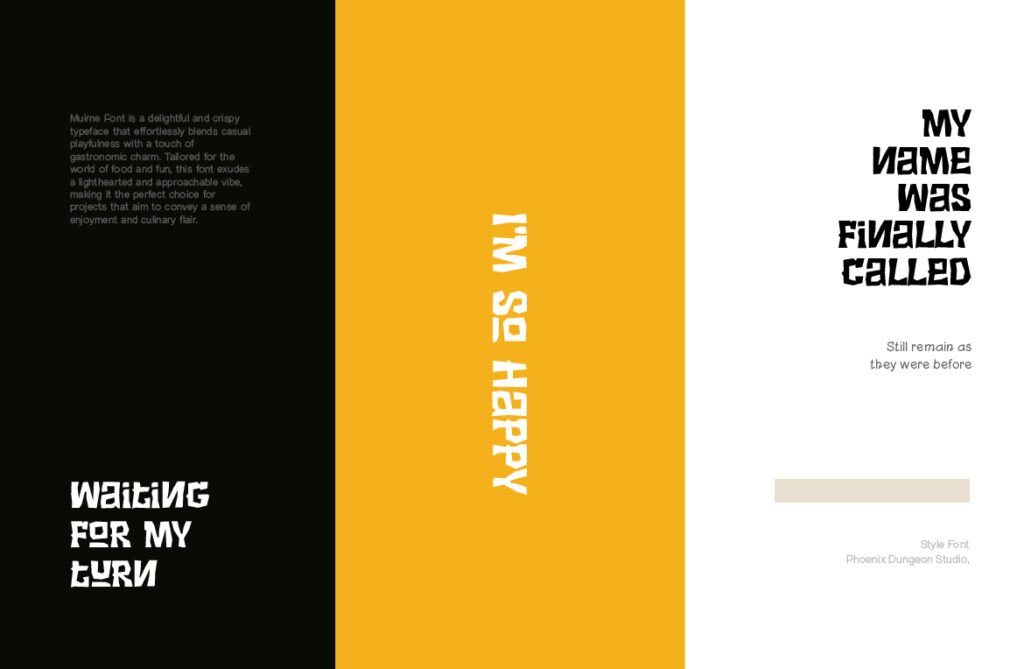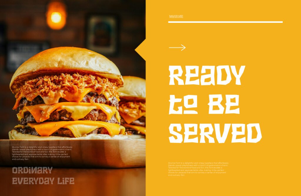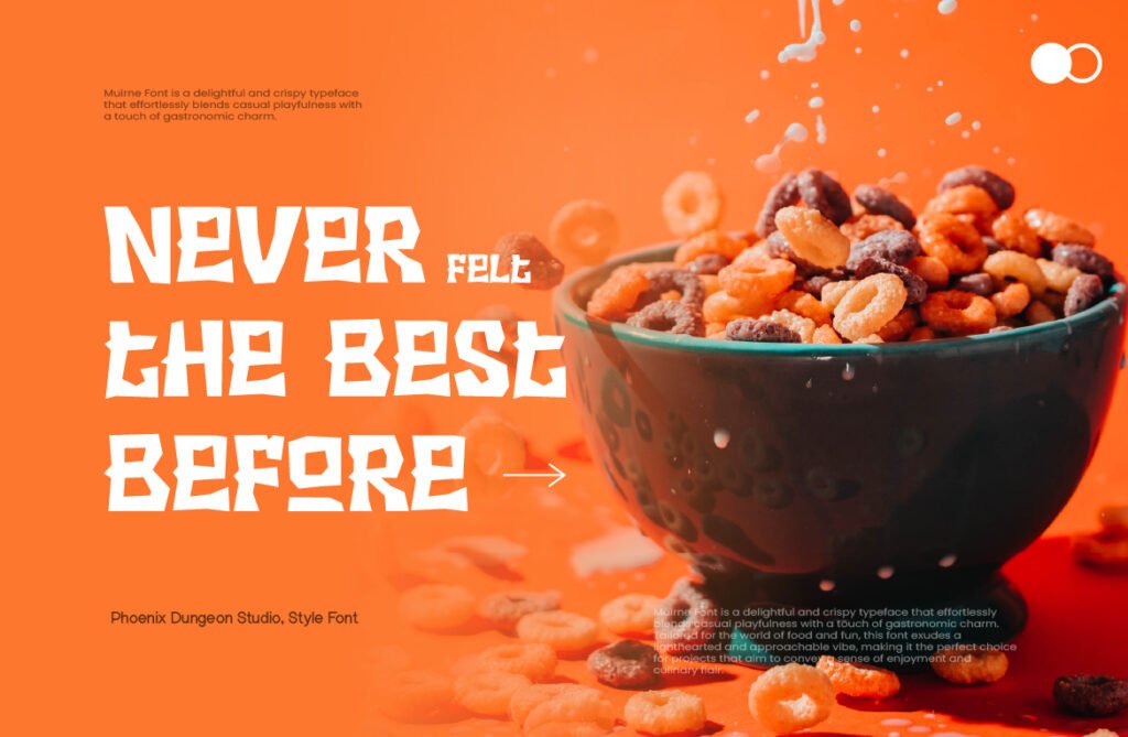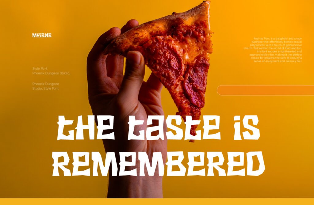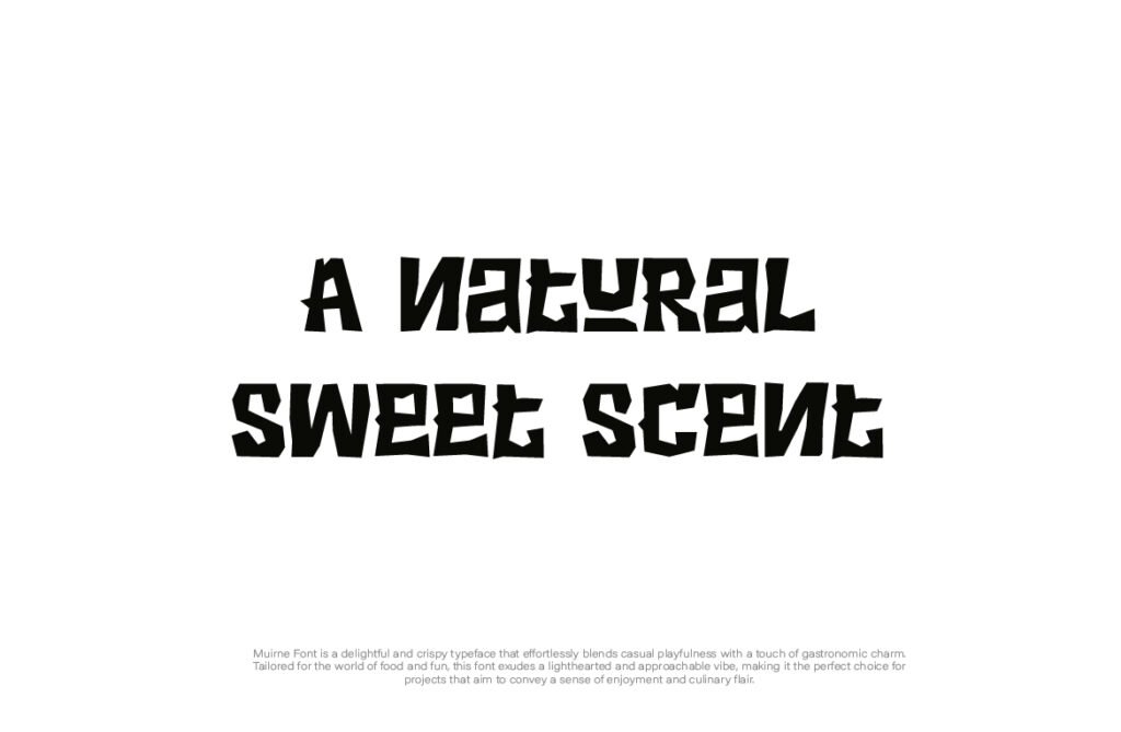 The font’s crisp structure and defined contours ensure excellent readability at larger sizes, making it ideal for use in posters, banners, menu boards, and packaging where clarity and charm must coexist. Available in multiple variations—including solid, outlined, and layered versions—Muirne offers designers the ability to experiment with depth and dimension. Muirne thrives in branding environments that emphasize craftsmanship, sustainability, and natural ingredients. It pairs beautifully with earthy tones, botanical illustrations, and rustic textures, reinforcing a warm and inviting aesthetic. Whether used in café branding, food blog headers, or seasonal promotions, this font enhances the visual narrative and emotional appeal of food-related content.