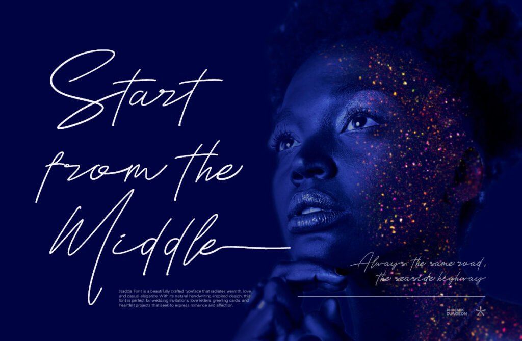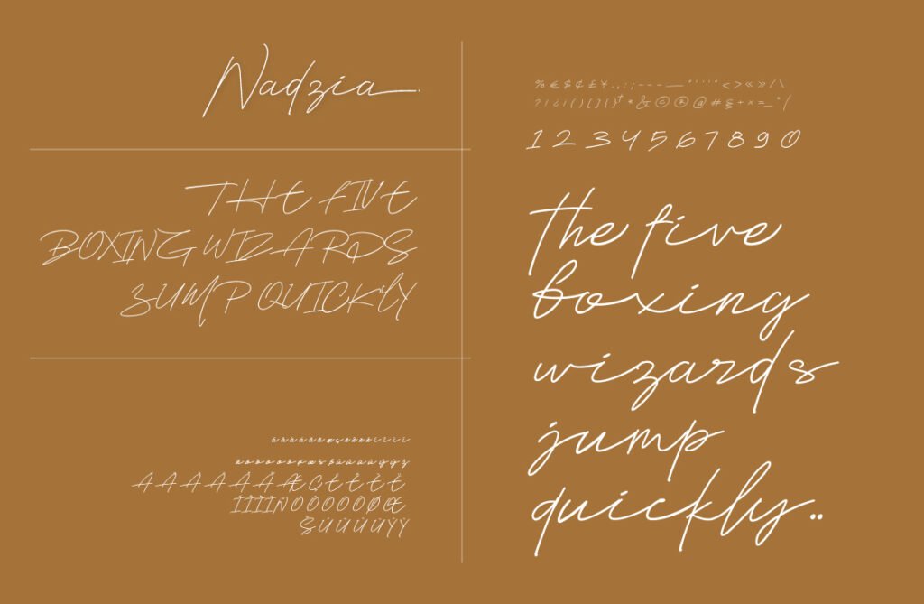 Despite its minimalist appearance, the font maintains excellent readability at moderate sizes, making it suitable for both print and screen-based applications. It includes a wide range of ligatures, alternate characters, and stylistic swashes that allow for personalized and elegant compositions. Nadzia works exceptionally well in branding environments that emphasize love, relationships, and personal connection. It pairs beautifully with floral motifs, pastel color schemes, and minimalist layouts, reinforcing a sense of warmth and sincerity. Whether used in greeting cards, boutique branding, or digital illustrations, Nadzia enhances the emotional tone and visual appeal of any design.