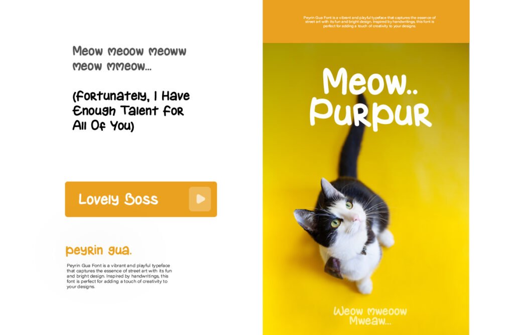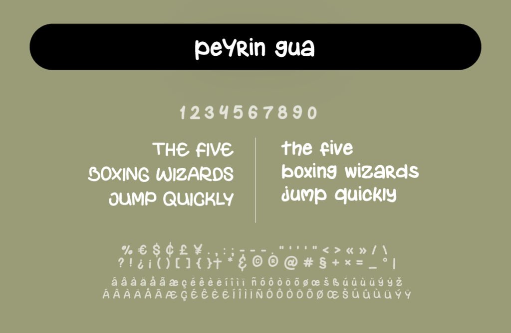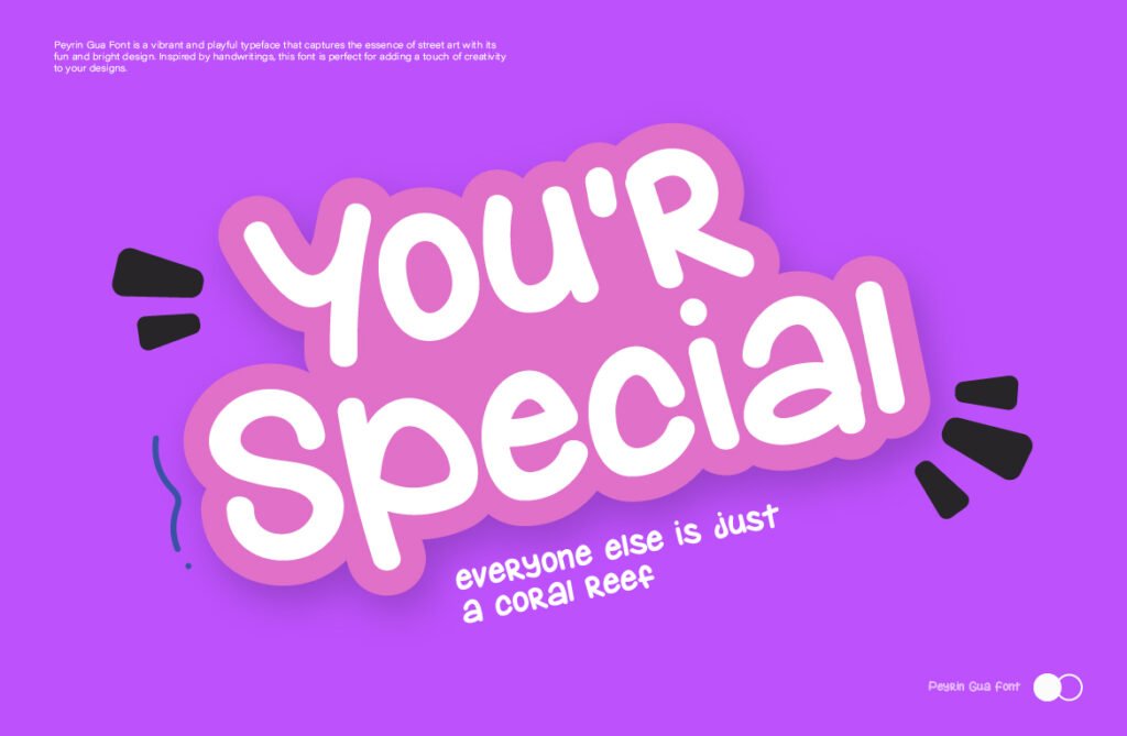 Peyrin Gua – Handwriting playfull display headline is a lively and expressive typeface that brings energy, charm, and a sense of fun to any design. This font mimics the natural rhythm of casual handwriting but with exaggerated strokes, bouncy baselines, and whimsical details that give it a distinct personality. Designed primarily for display use, Peyrin Gua is ideal for headlines, banners, posters, and digital graphics where visual impact and emotional appeal are key. The playful nature of Peyrin Gua makes it perfect for branding aimed at children, lifestyle content, social media posts, or creative packaging that wants to stand out with a youthful and spontaneous vibe.