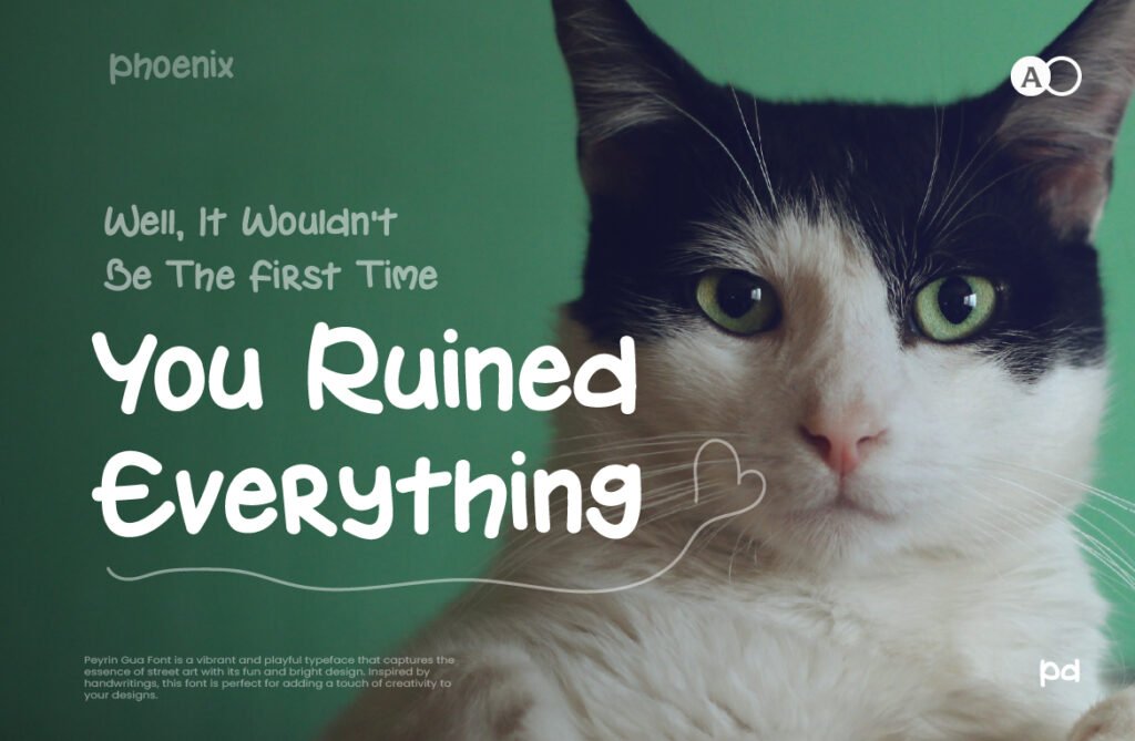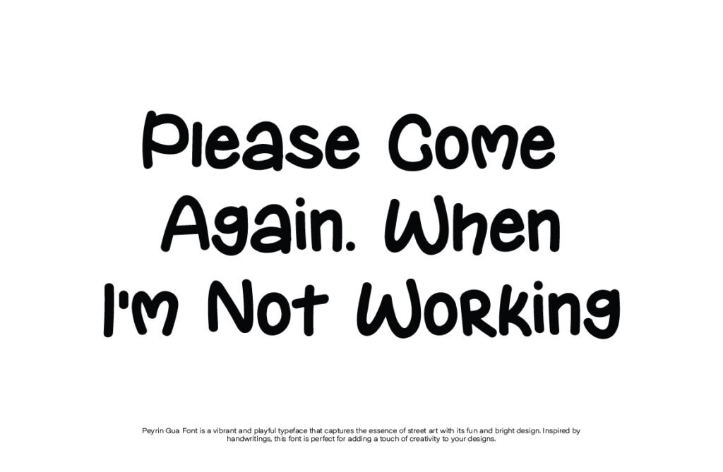 Despite its informal look, the font maintains a high level of legibility, especially at larger sizes, allowing it to function effectively across both print and digital platforms. It includes alternate characters, ligatures, and stylistic swashes, giving designers the flexibility to customize text for maximum expression. Whether used in product logos, event promotions, or animated media, Peyrin Gua adds a dynamic and personable touch that resonates well with modern audiences. Its energetic structure and organic feel make it a go-to choice for creatives who want to inject joy, movement, and creativity into their typography.