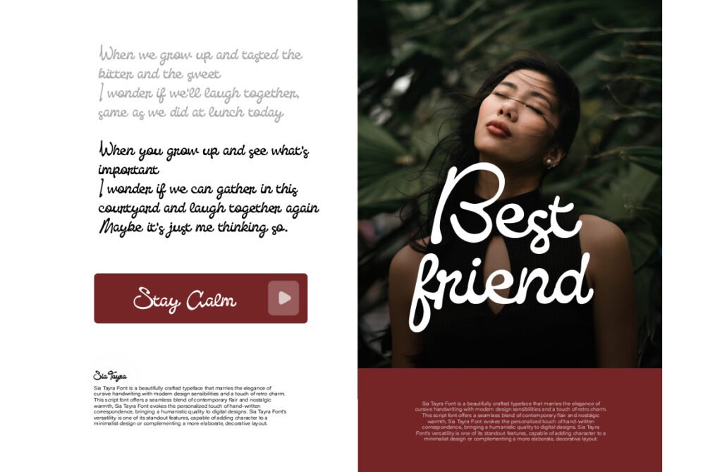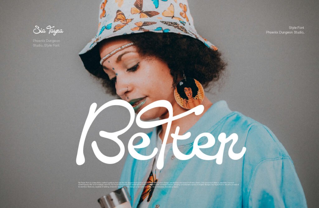 Despite its decorative nature, the font maintains excellent readability at larger sizes, making it ideal for use in posters, logos, packaging, and promotional banners. Available in multiple variations—including outlined, splatter-integrated, and textured versions—Sia Tayra allows for creative layering and customization to enhance visual storytelling. Sia Tayra works exceptionally well in environments that emphasize nostalgia, creativity, and spontaneity. It pairs beautifully with warm color palettes, retro gradients, and illustrated backgrounds, reinforcing a sense of authenticity and artistic depth. Whether used in boutique branding, vintage-themed promotions, or animated content, this font enhances the emotional tone and visual impact of any project.