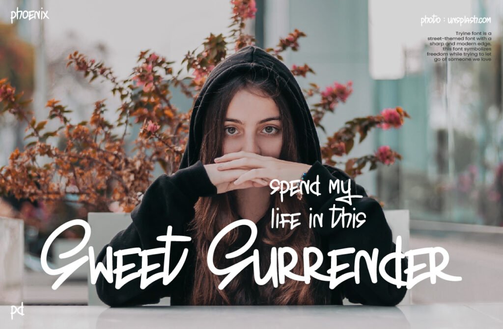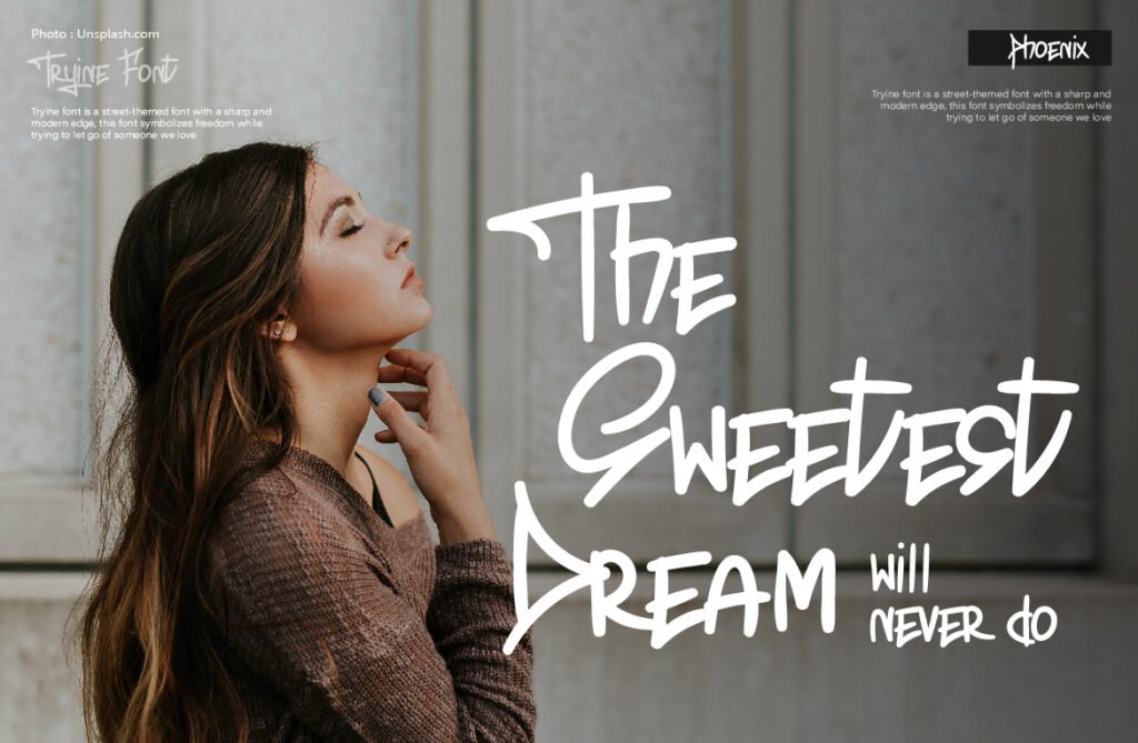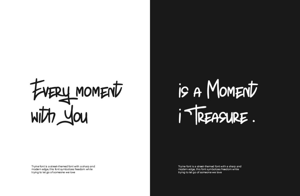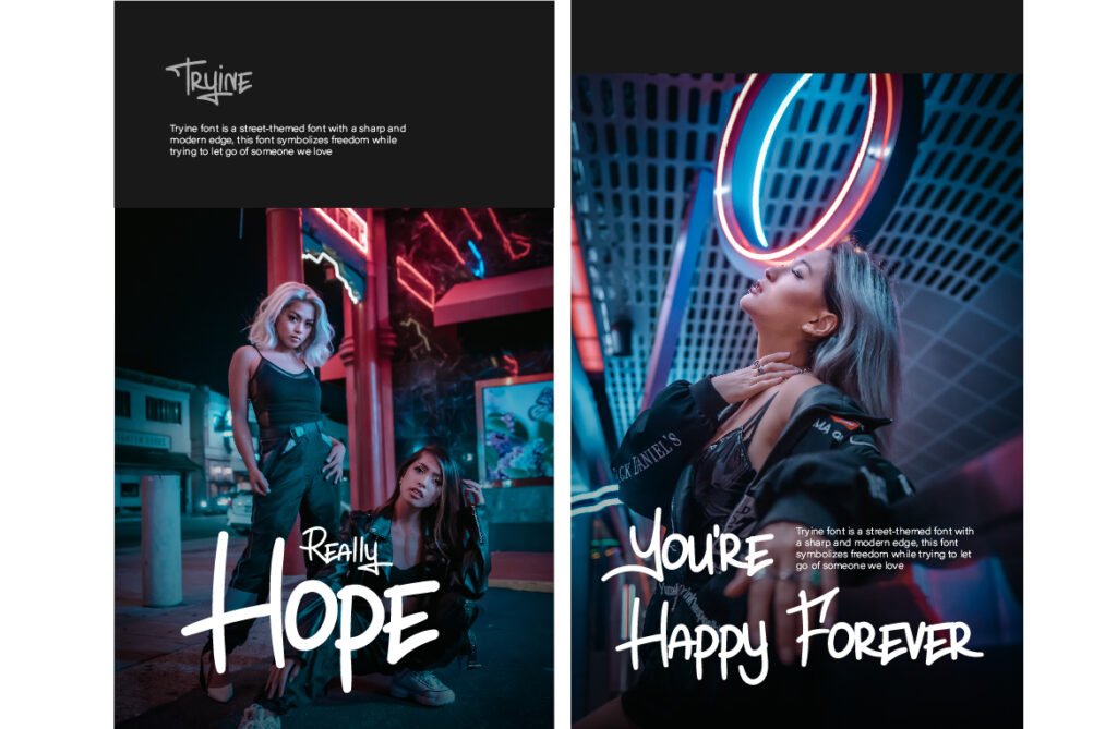 Perfect for edgy branding, streetwear campaigns, or visual storytelling with grit, Tryine disrupts the grid and forces you to look twice. It thrives in creative anarchy—where design is more about emotion than perfection. Use it when your message is loud, personal, and a little unhinged—in the best way.