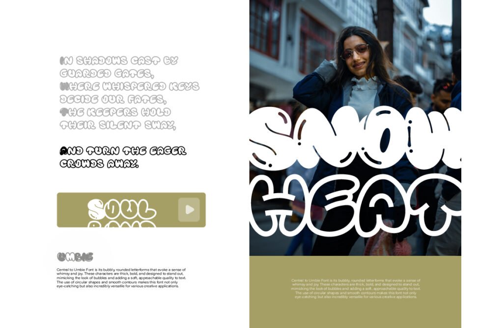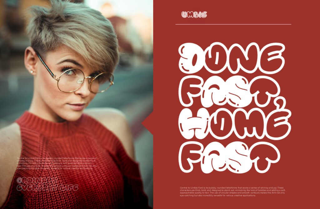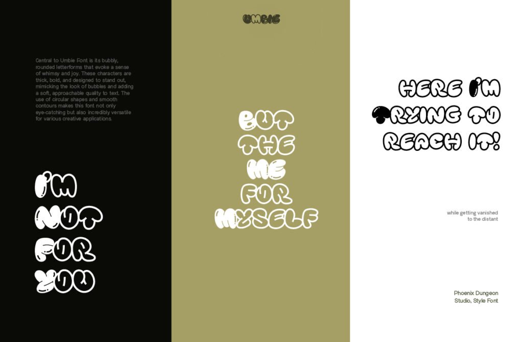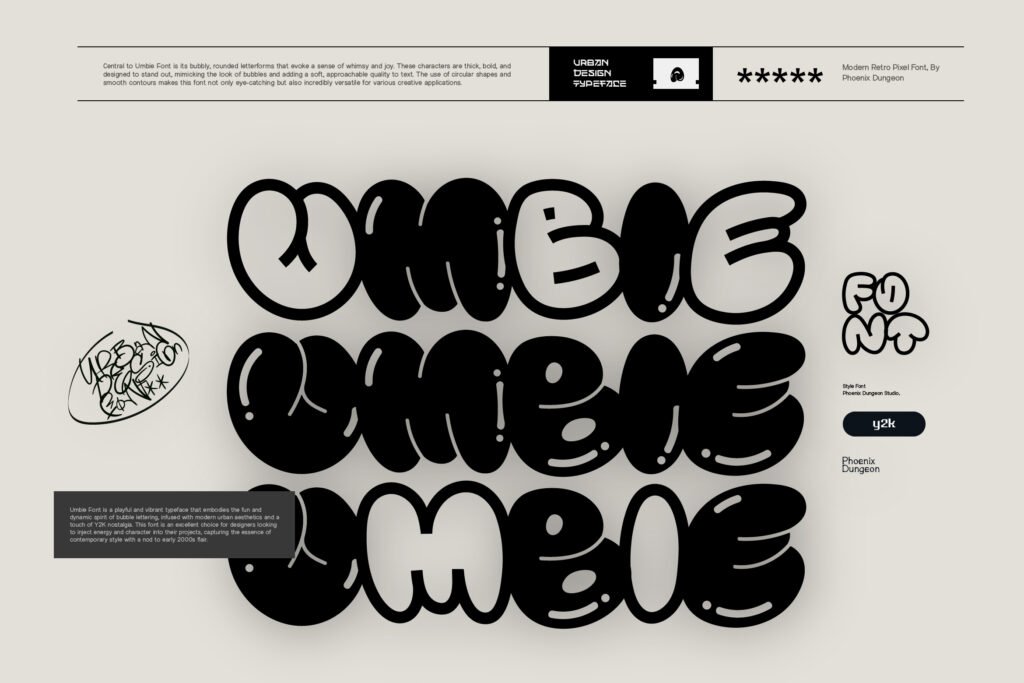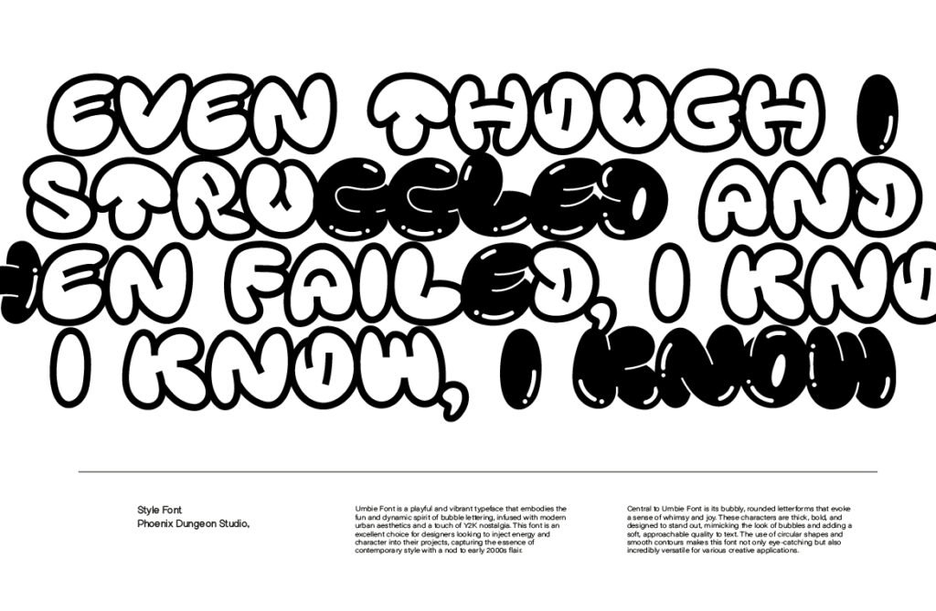 Despite its decorative nature, the font remains highly legible when used at moderate to large sizes, making it ideal for posters, logos, children’s books, and animated content. It supports alternate versions and stylistic sets, allowing designers to customize the look based on theme and context—from bubbly and cute to edgy and futuristic. Umbie works exceptionally well in designs targeting younger audiences, retro-themed brands, or lifestyle products that want to inject nostalgia and playfulness into their work. It pairs beautifully with neon gradients, chrome effects, and pixel-inspired textures, aligning perfectly with current trends in Gen Z aesthetics and digital revivalism. Whether used in apparel branding, event promotions, or digital illustrations, Umbie adds a layer of fun and personality that enhances the overall design experience.