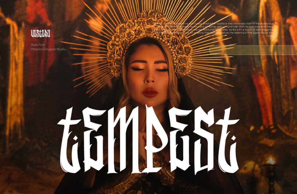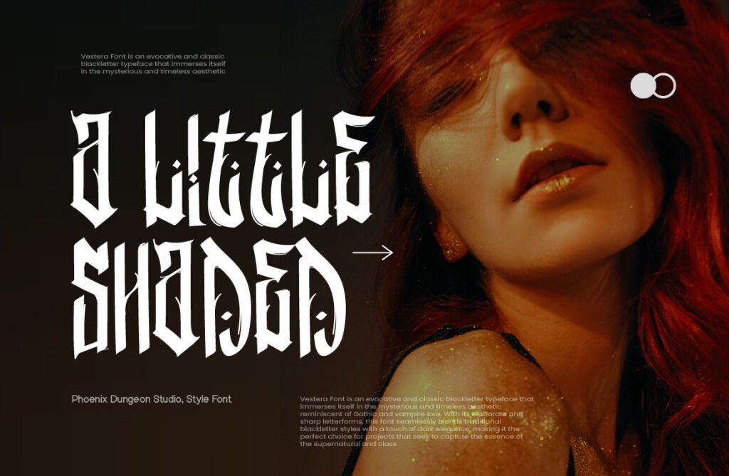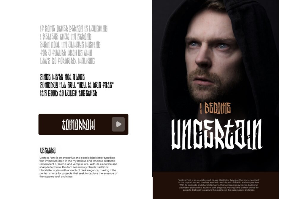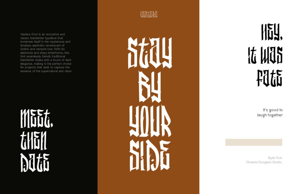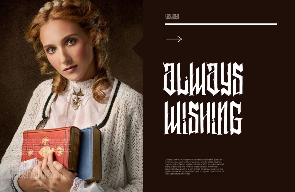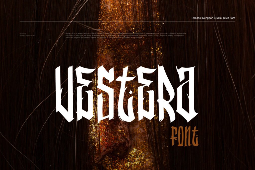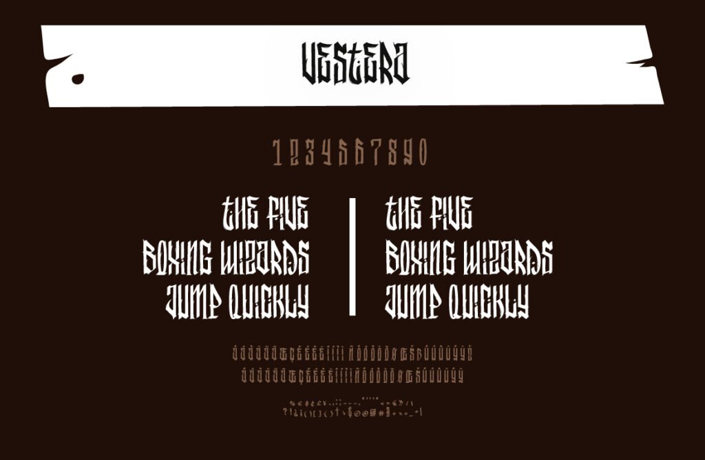 Despite its intense visual style, Vestera has been refined for modern readability, especially at larger sizes, making it effective in posters, logos, and banners that aim to create a bold and immersive typographic experience. The font includes multiple variations—such as outlined, shadowed, and textured versions—that allow for creative layering and customization. Vestera works exceptionally well in designs centered around dark fantasy, royal empires, or gothic themes. It pairs beautifully with parchment textures, blood-red accents, and heraldic emblems, reinforcing a sense of authenticity and storytelling. Whether used in RPG branding, horror-themed promotions, or medieval-inspired merchandise, Vestera enhances the visual narrative with its commanding presence.